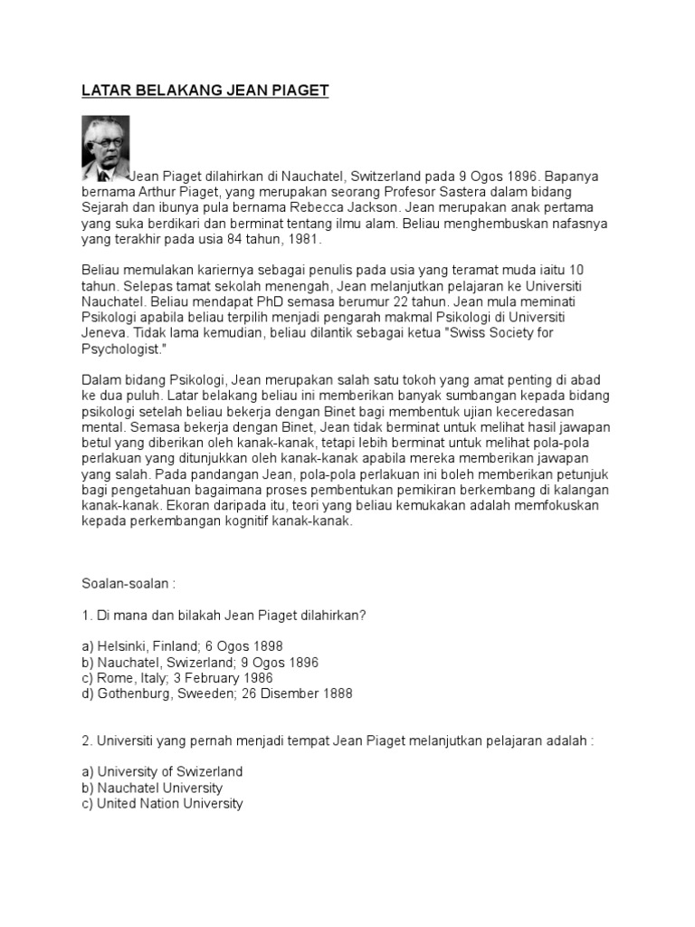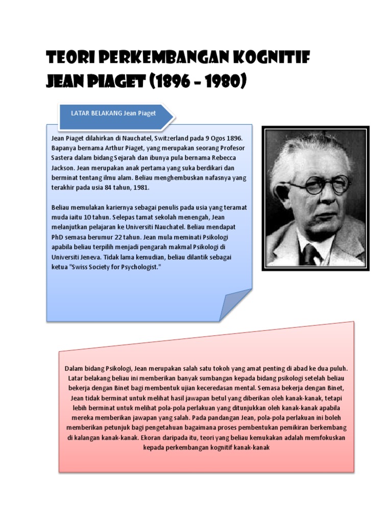Teori Kognitif Jean Piaget 1 Latar Belakang Piaget adalah seorang tokoh yang popular dalam bidang psikologi pendidikan yang berasal dari Switzerland. Bapanya bernama Arthur Piaget yang merupakan seorang Profesor Sastera dalam. Jean Piaget telah dilahirkan di Neuchâtel Switzerland pada 9 Ogos.